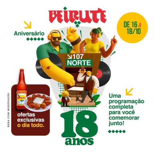 O icônico Beirute da Asa Norte está em festa! O bar mais querido de Brasília comemora 18 anos de história e preparou uma programação especial para celebrar sua maioridade com muito som, alegria e promoções exclusivas. As comemorações acontecem de 16 a 18 de outubro, nas duas unidades da casa — 107 Norte e 109 Sul.